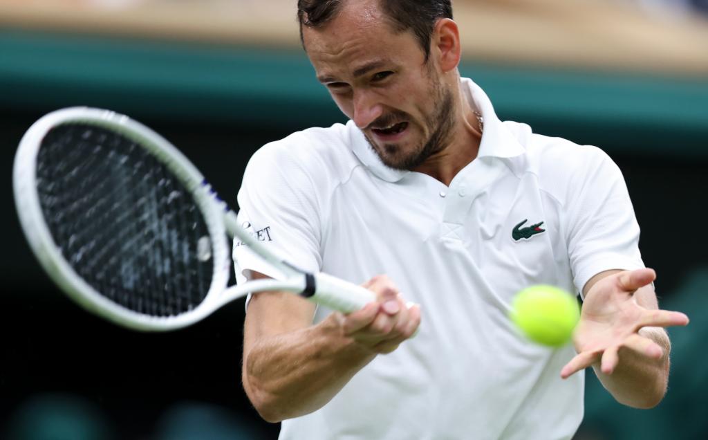 7月9日,梅德韋杰夫在比賽中回球。新華社記者 韓巖 攝
