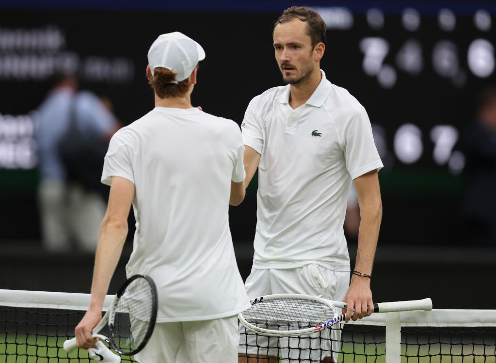 7月9日,梅德韋杰夫(右)在比賽后與辛納握手致意。新華社記者 韓巖 攝