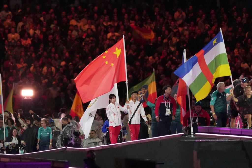 9月8日,巴黎殘奧會(huì)中國體育代表團(tuán)旗手女子游泳運(yùn)動(dòng)員蔣裕燕(中左)和男子田徑運(yùn)動(dòng)員邸東東(中右)在閉幕式上入場(chǎng)。新華社記者 黃偉 攝