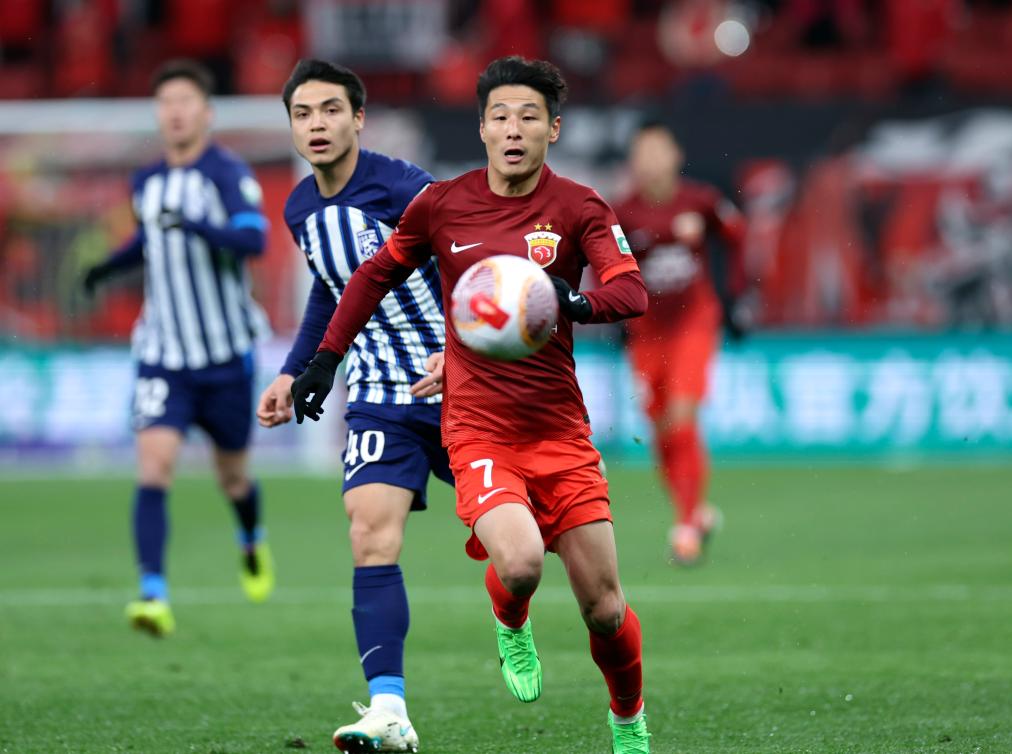 資料圖:2024年3月1日,上海海港隊球員武磊(右)在2024賽季中國足球協(xié)會超級聯(lián)賽揭幕戰(zhàn)中。新華社發(fā)(海沙爾攝)