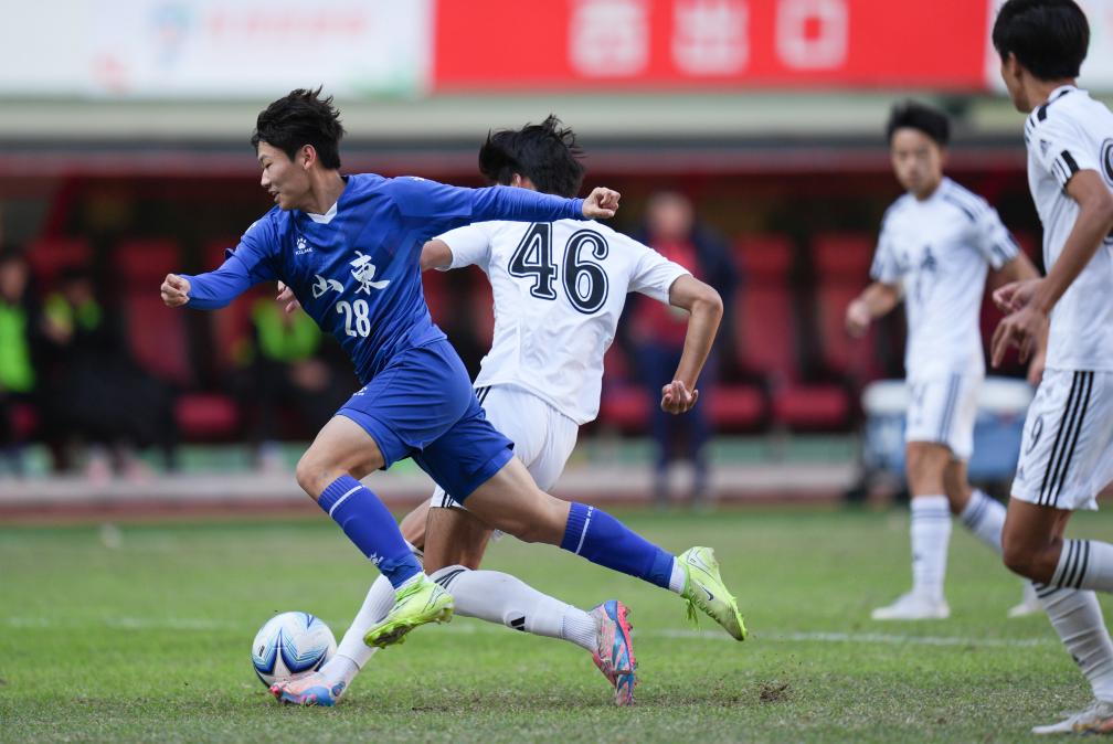 11月27日,山東隊球員陳子涵(左一)在比賽中進攻。當日,在第一屆青少年三大球運動會足球項目男子金牌賽中,山東隊1:0勝上海隊,奪得冠軍。新華社記者 薛宇舸 攝