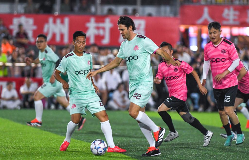 5月27日,卡卡(中)在“逐夢”冠軍明星公益賽中。當日,“逐夢”冠軍公益賽在貴州省黔東南苗族侗族自治州榕江縣“村超”球場舉行。新華社記者 楊文斌 攝