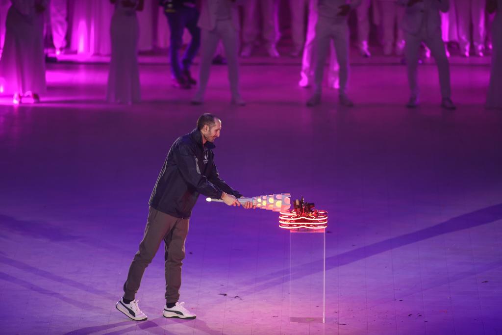 1月13日,意大利足球名宿基耶利尼在開(kāi)幕式上手持火炬,將一臺(tái)無(wú)人機(jī)“激活”。新華社記者 李京 攝