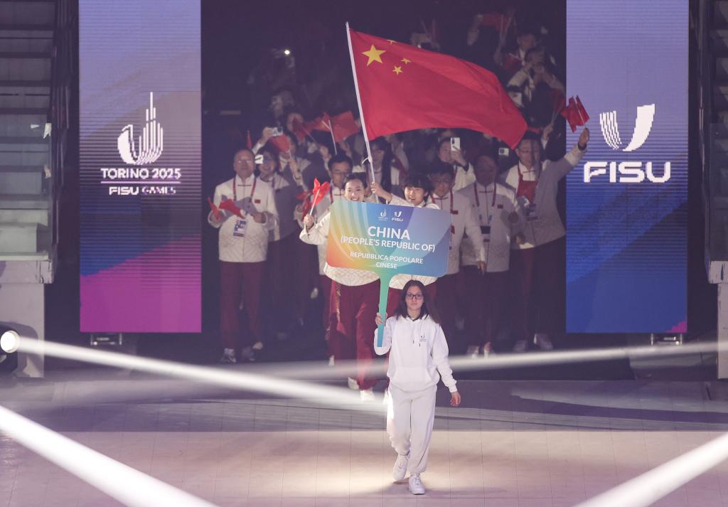 賽會(huì)開(kāi)幕式于當(dāng)晚在都靈奧林匹克體育館舉行。入場(chǎng)儀式上,來(lái)自北京體育大學(xué)的女子冰壺運(yùn)動(dòng)員裴君杭和北方工業(yè)大學(xué)的男子高山滑雪運(yùn)動(dòng)員劉祥琪共同擔(dān)任中國(guó)代表團(tuán)旗手。