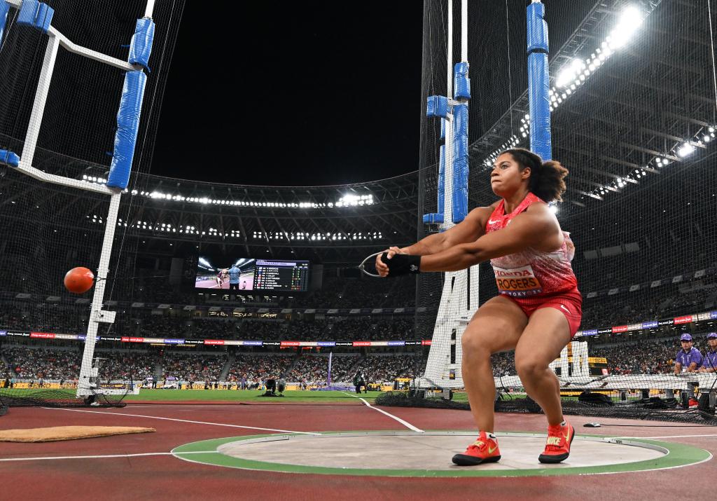 9月15日,加拿大選手羅杰斯在決賽中試投,最終她獲得冠軍。新華社記者 宋彥樺 攝