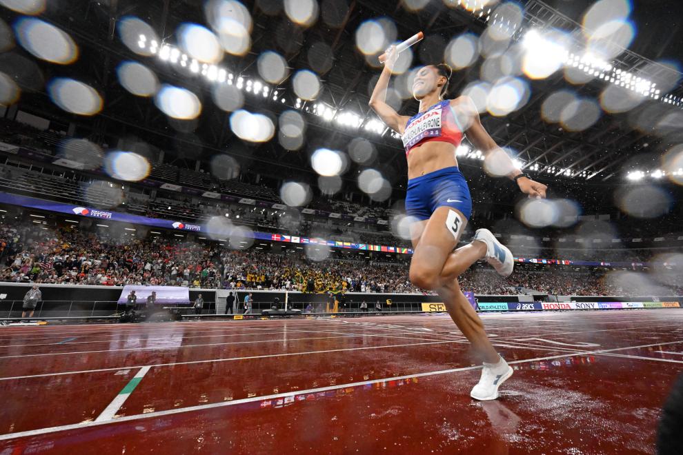 9月21日,2025年世界田徑錦標(biāo)賽女子4x400米接力決賽在日本東京舉行,圖為美國隊第四棒選手麥克勞林在賽后慶祝奪冠。新華社發(fā)(呂小煒攝)