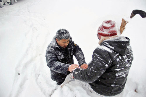 接到110指揮中心救援指令后,民警立即整裝出發(fā),并在途中與報警人周女士取得了聯(lián)系。車輛行至山間,救援難度超出了想象,整個山上都被大雪籠罩,白茫茫的一片,報警人也說不清自己遇險的具體位置。救援民警想到與報警人通過微信聯(lián)系,獲得位置共享。在得到大概位置后,車輛卻遇到冰雪無法前行,救援民警只能徒步前往,在被冰雪覆蓋的山路上一腳深一腳淺地行走,也記不清一路上跌跌撞撞摔倒了幾次,眼看著快接近信息顯示位置了,卻無法準(zhǔn)確定位,只能繼續(xù)聯(lián)系報警人,讓她試著喊幾聲,以便確定具體方位,聽到聲音后,民警順著聲音方向前進(jìn),經(jīng)過一個多小時的艱難跋涉,終于在去往鳳林寺半山腰的樹林里找到了周女士。簡單了解了周女士傷情后,民警康艷軍小心翼翼地把周女士一路背下了山,令其脫離了險境。