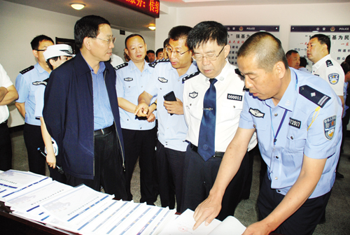 參加現(xiàn)場會的副市長武憲堂、省公安廳交管局局長賈繼武、市公安局副局長、交警支隊長袁小波等領導,在偏關縣公安局交警大隊觀摩(張軍 攝)
