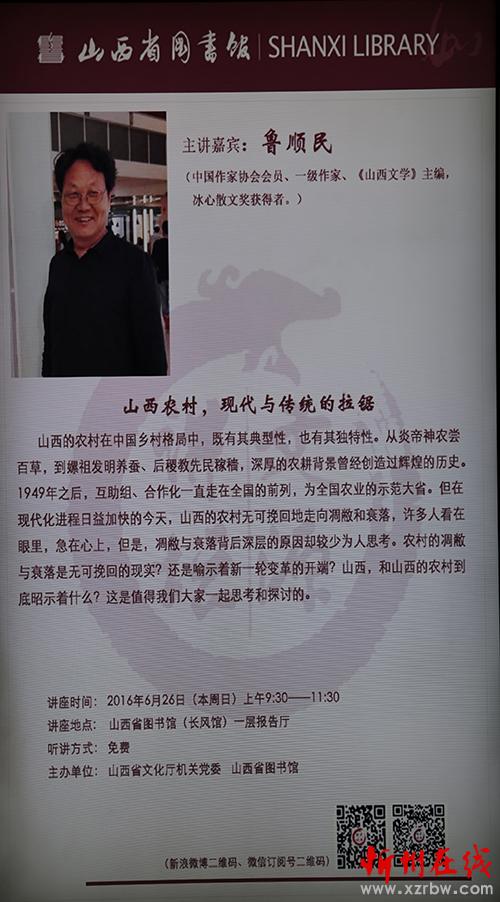 6月26日,魯順民作客山西省圖書館文源講壇,作了題為“山西農(nóng)村,現(xiàn)代與傳統(tǒng)的拉鋸”的講座。他從炎黃時(shí)期談起,鞭辟入里地講解山西農(nóng)業(yè)的歷史進(jìn)程;他以黑峪口為例,入木三分地揭露農(nóng)村凋敝的原因;他從戶口制度切入,刻畫入微地分析當(dāng)今農(nóng)民的現(xiàn)實(shí)問(wèn)題,魯順民將其觀察與思考與觀眾分享交流,再次引發(fā)了人們的思考與討論。針對(duì)魯順民對(duì)于三農(nóng)問(wèn)題的深刻見解以及在文學(xué)創(chuàng)作中的獨(dú)到之處,我們對(duì)其進(jìn)行了專訪。