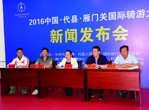 七月盛夏,古郡雁門,瓜果飄香,喜氣盈門。以“騎游中華第一關(guān),逐鹿千年古驛道”為主題的2016中國·代縣·雁門關(guān)國際騎游大會定于7月29日至30日隆重舉行,將云集來自全球20多個國家和地區(qū)的1000多名在國際、國內(nèi)自行車賽事中初具影響力的職業(yè)、業(yè)余選手參加。標準之高,規(guī)模之大,盛況空前。為了給雁門關(guān)國際騎游大會宣傳造勢,營造濃厚氛圍,大會組委會于7月20日下午在新城體育館會議室舉行2016中國·代縣·雁門關(guān)國際騎游大會新聞發(fā)布會,特邀來自省市新聞媒體的20多位記者參加。出席新聞發(fā)布會的領(lǐng)導(dǎo)有政府副縣長、大會組委會副主任劉愛珍,國家體育總局扶貧工作組組長、大會組委會副主任李立東,代縣體育運動管理中心主任、大會組委會委員侯發(fā)平,深圳天珺體育咨詢有限公司賽事總監(jiān)張學(xué)勇。