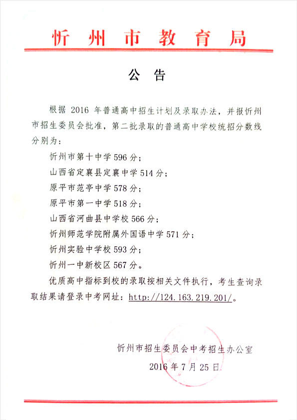 忻州市公布2016年第二批普通高中學(xué)校統(tǒng)招分?jǐn)?shù)線