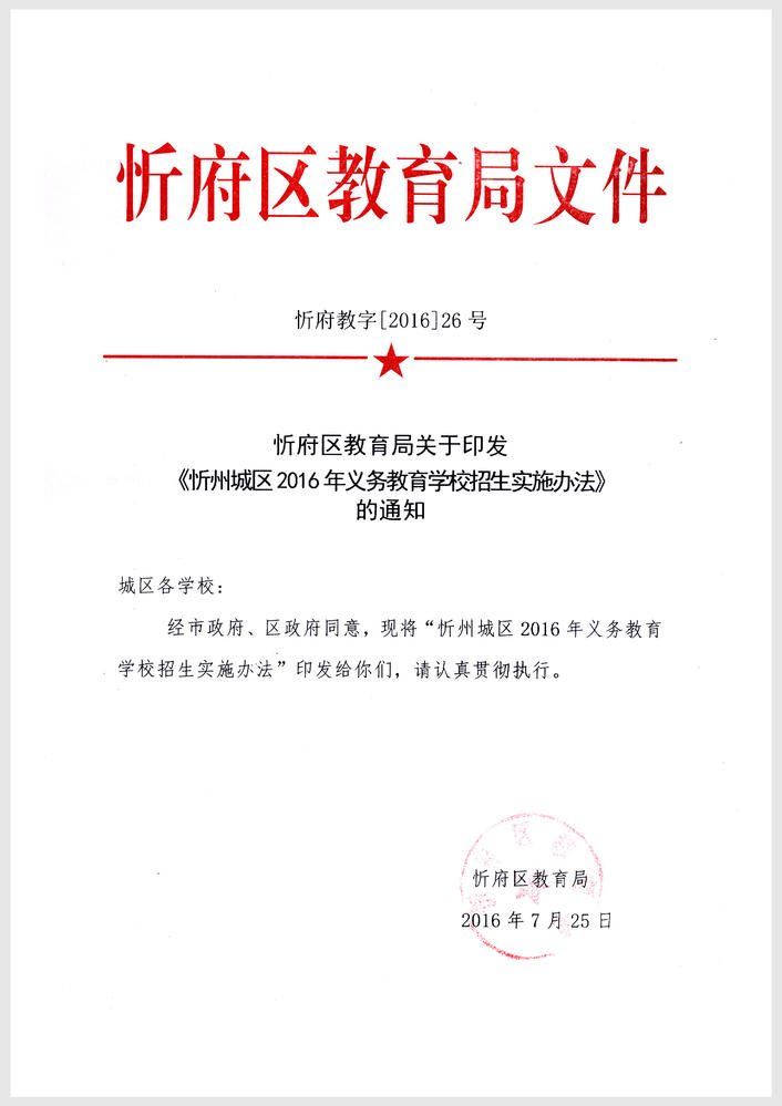忻州城區(qū)2016年義務教育學校招生實施辦法