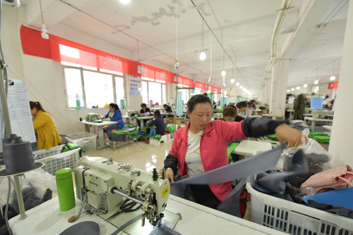 下茹越鄉(xiāng)的貧困戶蘇金娥是這家工廠的員工,“以前沒有工作,家里頭也挺困難,這會兒政府開設(shè)這個項目,我就過來試試,結(jié)果也挺好...這里有師傅教,每天可以學(xué)習(xí)...這幾天也熟練啦,每天可以做100多件,今年肯定能脫貧?!辈簧蒲赞o的蘇金娥在提到這份工作時滿臉笑容,斷斷續(xù)續(xù)的敘述中可以感受到她那喜悅的心情。