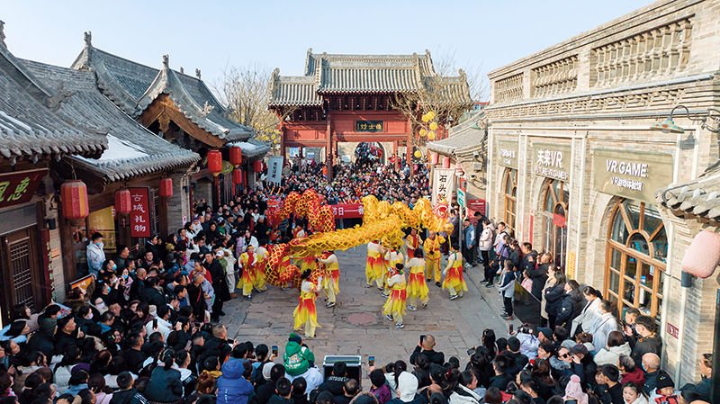 山西省忻州市忻州古城春節(jié)文化活動上的舞龍表演(2024年2月11日攝) 石薦文攝