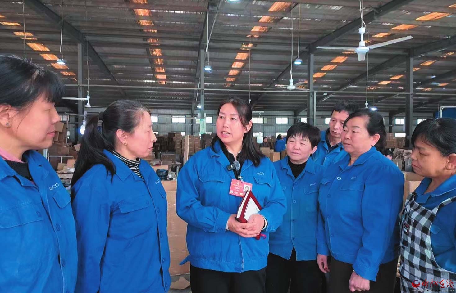 范銀蓮在車間宣講全國兩會(huì)精神。