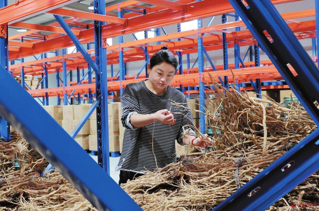 恒宇天然草本資源有限公司黃芪藥材倉庫工作人員正在檢查黃芪的保存情況。記者范琛攝