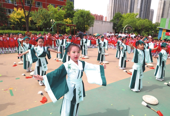 實驗幼兒園的孩子們正在進行漢風古韻表演。 本報記者 張存良攝