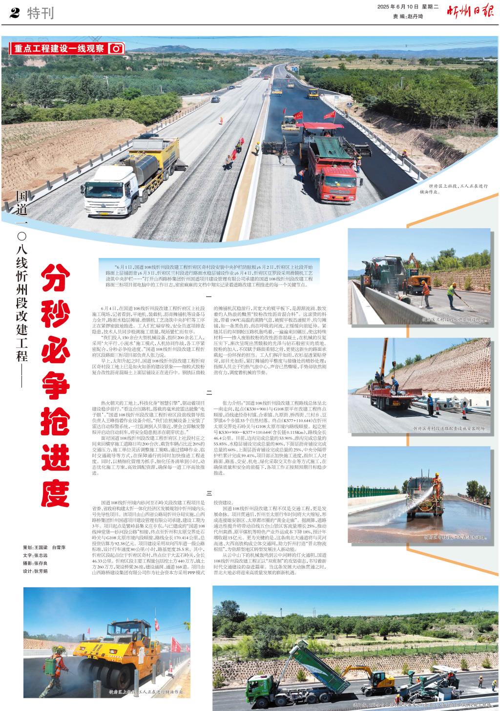 “6月1日,國道108線忻州段改建工程忻府區(qū)奇村段安裝中央護(hù)欄防眩板;6月2日,忻府區(qū)上社段開始路面上層鋪瀝青;6月3日,忻府區(qū)蘭村段進(jìn)行路面水穩(wěn)層鋪設(shè)作業(yè);6月4日,忻府區(qū)豆羅段采用滑膜機(jī)工藝澆筑中央護(hù)欄……”打開山西路橋集團(tuán)忻州國道項目建設(shè)管理有限公司承建的國道108線忻州段改建工程路面三標(biāo)項目部電腦中的工作日志,密密麻麻的文檔中翔實記錄著道路改建工程推進(jìn)的每一個關(guān)鍵節(jié)點。