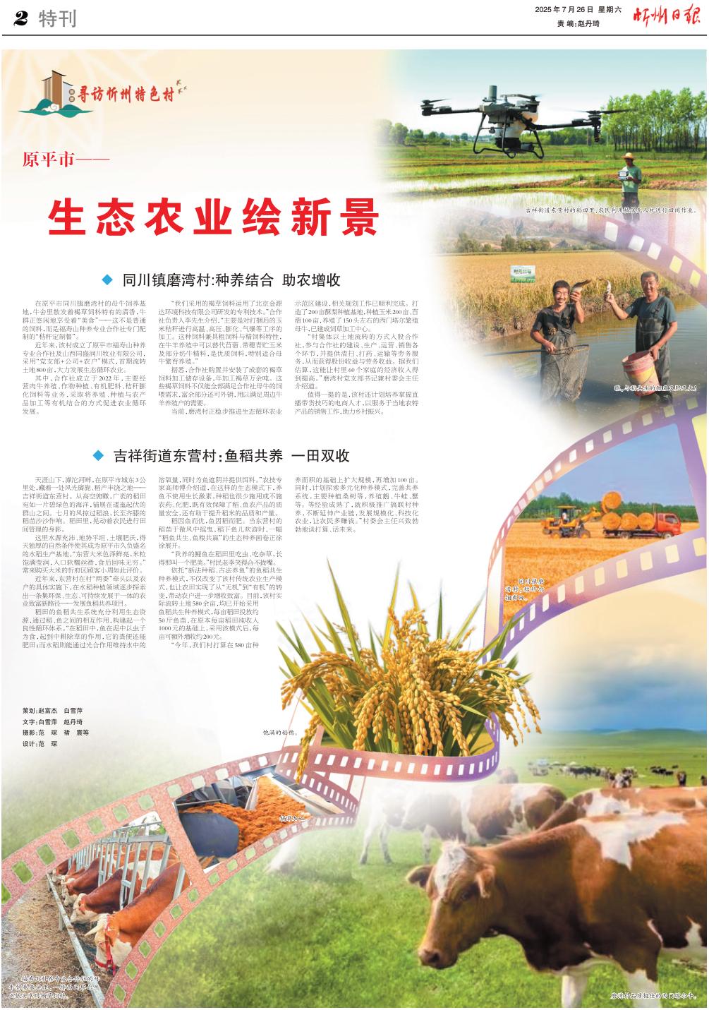天涯山下,滹沱河畔,在原平市城東3公里處,藏著一處風(fēng)光旖旎、稻產(chǎn)豐饒之地——吉祥街道東營村。從高空俯瞰,廣袤的稻田宛如一片碧綠色的海洋,鋪展在逶迤起伏的群山之間。七月的風(fēng)掠過稻浪,長至齊膝的稻苗沙沙作響。稻田里,晃動著農(nóng)民進(jìn)行田間管理的身影。