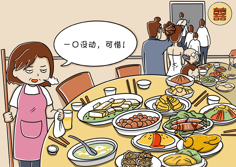 杜絕“剩宴”需要社會(huì)合力。結(jié)婚“剩宴”并不是短時(shí)間形成的,也不是個(gè)別現(xiàn)象,因此,根治這種陋習(xí)、在全社會(huì)培養(yǎng)節(jié)約意識(shí)和節(jié)儉習(xí)慣是一項(xiàng)長(zhǎng)期任務(wù),也是一項(xiàng)全民行動(dòng),需要社會(huì)各界多元化、多角度共同推進(jìn)。比如,黨員干部以身作則,率先垂范;餐飲行業(yè)增強(qiáng)節(jié)約意識(shí),改進(jìn)服務(wù),合理優(yōu)化供應(yīng)標(biāo)準(zhǔn)。只有人人轉(zhuǎn)變觀念,共同做厲行節(jié)約、反對(duì)浪費(fèi)的踐行者、宣傳者和監(jiān)督者,才能帶動(dòng)形成良好社會(huì)風(fēng)氣。(文字:馬若虎 漫畫:甘甜)