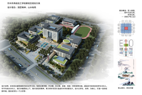 我們本著國匠精神-九宮格布局、山水格局-背山面水、四水歸堂的設計理念,團結上學、振興技校的精神,努力將本項目打造成為忻州市的新名片,圓技校學生一個大學夢。我們注重整體空間的舒適性、藝術性,不強調過分統(tǒng)一。設計中注重細節(jié)處理和學生們行為模式的考慮;將環(huán)境氣氛和設施布置的更具有靈活性、親和力,適應寬松、生活化的教學模式。