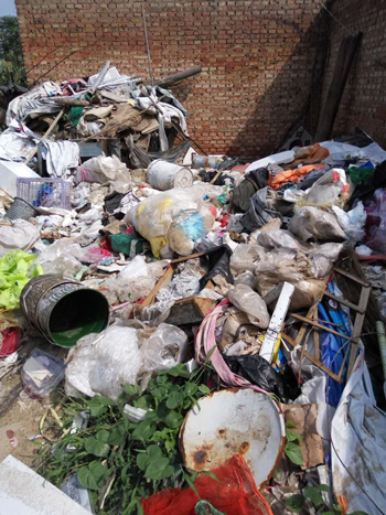8月2日上午,在村民的陪同下來到匡村村南,在忻州烈士陵園背后一個(gè)叫周家(音)墳的地方,看到路口黑色的玉米桿躺放在井蓋上,生銹的用鋼管焊成的院門兩邊和門口,堆放著五顏六色的塑料袋以及廢塑料和破鐵桶等生活垃圾破爛,連院內(nèi)也同樣是垃圾。