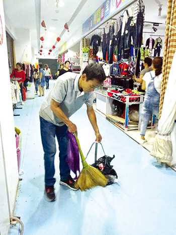 整個(gè)云河商場只有一層,共60多家商戶,衛(wèi)生清潔一天3次,工作量雖然不是很大,卻也不輕松。記者見到老馬時(shí),他正在做商場關(guān)門前的最后一次清掃。不時(shí)有商戶喊老馬過去收紙箱和塑料袋,老馬加快了手里的動(dòng)作?!吧虉鍪枪矆鏊?,管理也挺嚴(yán)格的,我得隨時(shí)注意看哪里有了垃圾,或是公共設(shè)施出了問題,要不人來人往怕出事。干凈整潔的環(huán)境代表著商場的形象,也能讓顧客購物時(shí)有個(gè)好心情,這也是我工作的價(jià)值吧?!崩像R坦言,有的人衛(wèi)生習(xí)慣特別不好。商場里童裝生意最為火爆,有個(gè)別帶孩子的家長直接讓孩子隨地大小便,不僅弄臟了環(huán)境也作了不良示范。老馬希望通過創(chuàng)衛(wèi),大家愛護(hù)環(huán)境衛(wèi)生的意識(shí)得到提高,這樣他也可以輕松點(diǎn)了。(王菲)