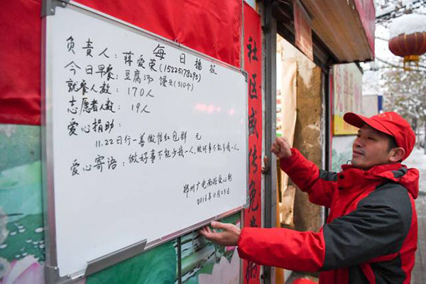 圖說(shuō):志愿者在懸掛“每日播報(bào)”,將早餐內(nèi)容、就餐人數(shù)等信息公布在愛(ài)心粥屋門口(11月23日攝)。圖片來(lái)源:新華社