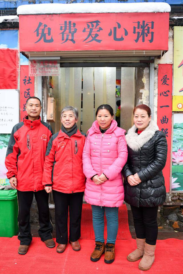 圖說(shuō):蔣愛(ài)榮(左二)與志愿者們?cè)趷?ài)心粥屋前合影(11月23日攝)。圖片來(lái)源:新華社