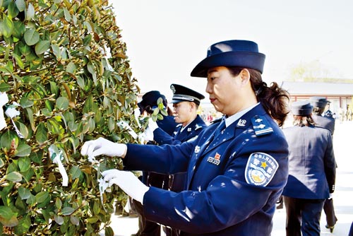 在烈士紀(jì)念碑前,大家重溫了入黨誓詞,許下莊嚴(yán)神圣的諾言,向革命烈士紀(jì)念碑敬獻(xiàn)花圈,集體脫帽低頭默哀,緬懷革命先烈勇于拼搏、甘于奉獻(xiàn)的崇高品質(zhì)。民警們參觀了烈士紀(jì)念碑,了解烈士事跡,并紛紛將胸前的小白花掛到了紀(jì)念碑旁邊的樹上,表示要牢記人民警察的神圣誓言和莊嚴(yán)使命,踐行“忠誠、為民、公正、奉獻(xiàn)”的人民警察核心價值觀,傳承革命烈士的精神和情懷,履行好維護社會和諧穩(wěn)定的職責(zé),以飽滿的熱情和昂揚的斗志為公安事業(yè)貢獻(xiàn)自己的全部力量。(魯明強 劉慧云)