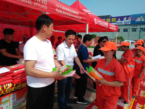 本網(wǎng)訊 7月16日上午,忻府區(qū)華琳食品有限公司在體育廣場舉辦“金沙河集團(tuán)向忻州環(huán)衛(wèi)工人致敬”的慰問活動(dòng)。向忻州約1300名環(huán)衛(wèi)工人捐贈(zèng)“金沙河”牌掛面、刀削面等食品,捐贈(zèng)價(jià)值達(dá)上萬元。