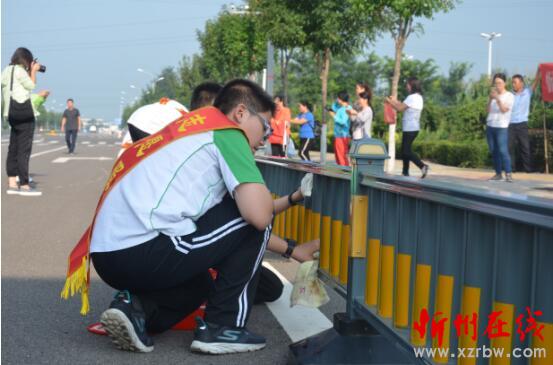 參加活動(dòng)的學(xué)生,在環(huán)衛(wèi)工人指導(dǎo)下擦試道路中間的隔離欄。