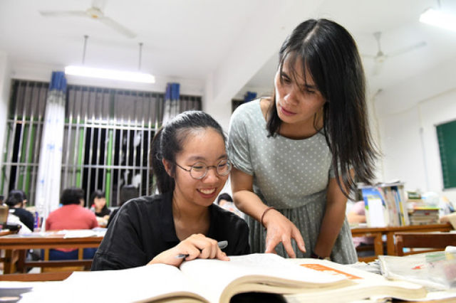 廣西都安縣高級中學(xué)老師韋喜鳳(右)在輔導(dǎo)學(xué)生功課(6月6日攝)。新華社記者 陸波岸 攝