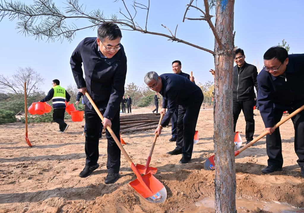 當(dāng)日上午,朱曉東一行抵達(dá)牧馬河生態(tài)公園植樹點,首先聽取忻府區(qū)牧馬河生態(tài)公園項目總體規(guī)劃情況匯報,詳細(xì)了解牧馬河流域生態(tài)修復(fù)工程項目進(jìn)展情況。隨后,大家拿起鐵鍬、水桶等工具,走向植樹地點,分工協(xié)作、配合默契,鏟土、移苗、扶苗、澆水、踩實……植樹現(xiàn)場繁忙而有序,一派熱火朝天景象。春風(fēng)過處,一株株新栽種的苗木錯落有致、迎風(fēng)挺立,萌發(fā)著無限生機和希望。