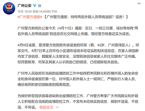 為做好新型冠狀病毒感染的肺炎疫情防控工作,廣州警方希望廣大市民群眾和外籍人士積極配合當前的疫情防控工作,不發(fā)布未經(jīng)核實的信息,做到不造謠、不信謠、不傳謠。