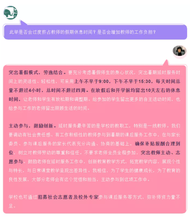 總的來說,各地開設(shè)的暑期托管服務(wù),老師與學(xué)生都以自愿為原則,托管期間不組織學(xué)科培訓(xùn)和集體授課,托管場所不局限于學(xué)校,輔導(dǎo)老師來源多元,并非僅為在校老師,還有志愿者、社工、校外專家等。因此,并不存在取消教師暑假的情況。