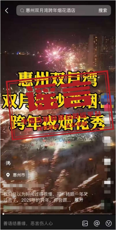 真相:近期,網(wǎng)絡(luò)上出現(xiàn) “廣東惠州雙月灣2025跨年煙花秀”“2025雙月灣跨年倒數(shù)夜”“雙月灣跨年煙花秀”等信息,引發(fā)關(guān)注。經(jīng)相關(guān)部門核實,網(wǎng)傳信息均系不實信息。目前廣東省惠州市惠東縣雙月灣沒有舉辦2025年跨年煙花秀活動的安排,請廣大游客不聽謠、不信謠、不傳謠,一切以官方發(fā)布信息為準。(來源:“惠州日報”微信公眾號、惠東文旅體)