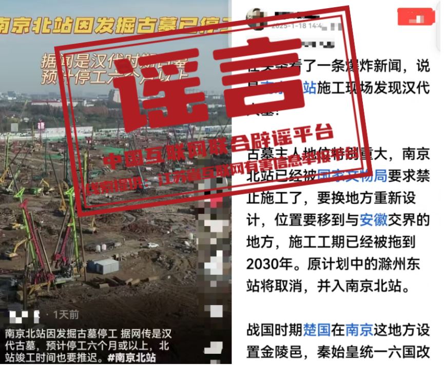 真相:近日,有網(wǎng)民在網(wǎng)絡(luò)平臺(tái)發(fā)帖稱,南京北站因挖到古墓,“已經(jīng)被國(guó)家文物局要求禁止施工了”“預(yù)計(jì)停工六個(gè)月或以上”“施工工期已經(jīng)被拖到2030年”等。經(jīng)江蘇省互聯(lián)網(wǎng)辟謠平臺(tái)與省文物部門和屬地核實(shí),目前沒(méi)有收到國(guó)家文物局關(guān)于“南京北站禁止施工”的有關(guān)通知,南京北站除個(gè)別涉及考古發(fā)掘作業(yè)區(qū)域外,其他施工作業(yè)均按計(jì)劃正常有序推進(jìn),網(wǎng)傳信息系謠言。(來(lái)源:江蘇省互聯(lián)網(wǎng)辟謠平臺(tái)、“南京網(wǎng)絡(luò)辟謠”微信公眾號(hào))