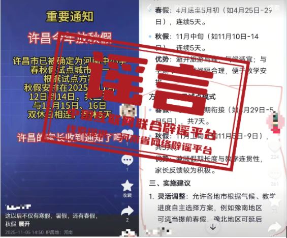 真相:近日,河南、安徽部分自媒體平臺(tái)發(fā)布關(guān)于中小學(xué)春秋放假的信息,聲稱“許昌市已被確定為河南中小學(xué)春秋假試點(diǎn)城市之一”“周口市中小學(xué)2025年秋假時(shí)間安排如下”“蕪湖市中小學(xué)將在11月12日至14日放首個(gè)秋假,連周末共5天”,引發(fā)關(guān)注。對(duì)此,河南許昌、周口及安徽蕪湖教育部門作出回應(yīng):并無放秋假的安排,網(wǎng)傳消息均為謠言。中小學(xué)放假安排需嚴(yán)格遵循國(guó)家教育方針政策及當(dāng)?shù)亟逃块T的統(tǒng)一部署,結(jié)合本地教育教學(xué)實(shí)際統(tǒng)籌規(guī)劃。如需了解相關(guān)安排,請(qǐng)通過屬地教育部門官方網(wǎng)站,切勿輕信、傳播未經(jīng)官方確認(rèn)的“小道消息”。(來源:“清朗河南”微信公眾號(hào)、@大河網(wǎng)、安徽網(wǎng)絡(luò)辟謠平臺(tái))
