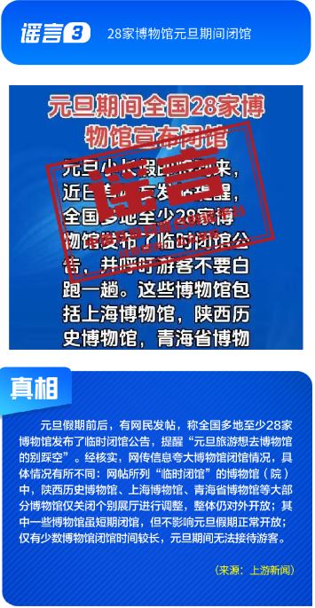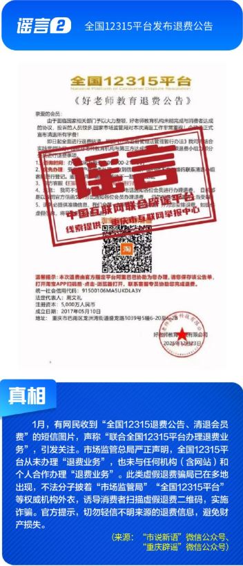 ??公共政策領(lǐng)域謠言誤導(dǎo)公眾決策?!吧绫?]有有效期限制、未到期不能換新卡”是對(duì)社保卡管理政策的誤讀,給民眾平添困擾;“28家博物館元旦期間閉館”實(shí)為少數(shù)博物館根據(jù)運(yùn)營(yíng)安排所做的微調(diào),網(wǎng)帖嚴(yán)重夸大實(shí)際閉館情況,引發(fā)負(fù)面炒作;“深圳有望推行12年義務(wù)教育,高中免費(fèi)”是對(duì)現(xiàn)行政策的“超前編造”,誤導(dǎo)學(xué)生及家長(zhǎng)群體;“全國(guó)12315平臺(tái)發(fā)布退費(fèi)公告”,則是假冒監(jiān)管機(jī)構(gòu)名義散播不實(shí)通知,為后續(xù)詐騙行為做鋪墊。