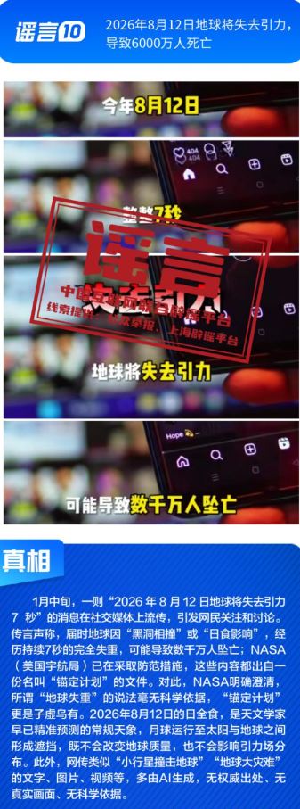 ??健康與科普領(lǐng)域謠言違背客觀規(guī)律?!叭搜椎鞍资恰黾用庖吡Α姆▽殹笨桃饪浯笤撎幏剿幍呐R床用途,忽略其特定醫(yī)療場(chǎng)景與使用風(fēng)險(xiǎn);所謂“大棚草莓、冷庫(kù)葡萄、進(jìn)口車?yán)遄?、染色砂糖橘是冬天水果界四大毒王”謠言片面解讀農(nóng)產(chǎn)品種植與保鮮方式,缺乏科學(xué)依據(jù);“四川兩只雄性大熊貓首次成功自然交配”純屬為吸引流量而捏造的獵奇內(nèi)容,其視頻畫面為AI生成;“2026年8月12日地球?qū)⑹ヒ?,?dǎo)致6000萬人死亡”更是無中生有的荒謬謠言。