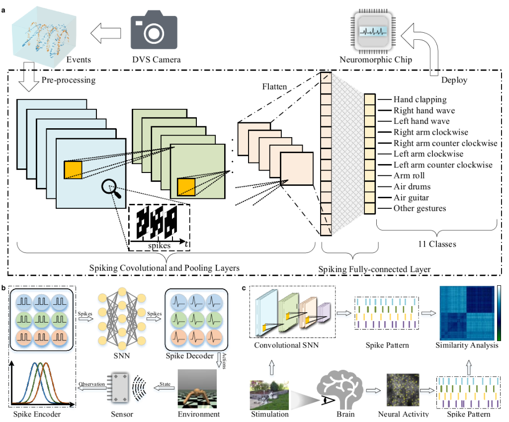 李國齊介紹,傳統(tǒng)脈沖神經(jīng)網(wǎng)絡(luò)框架更多地關(guān)注生物可解釋性,并不支持自動微分,無法充分利用GPU的大規(guī)模并行計算能力,也缺乏對神經(jīng)形態(tài)傳感器和計算芯片的支持?!绑@蟄”框架很大程度上解決了上述問題,支持神經(jīng)形態(tài)數(shù)據(jù)處理、深度脈沖神經(jīng)網(wǎng)絡(luò)構(gòu)建和神經(jīng)形態(tài)芯片部署等多項功能。