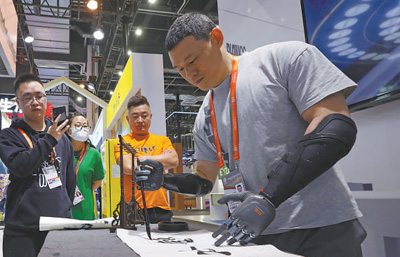 中國品牌博覽會上,工作人員用腦機(jī)科技操控的假肢寫毛筆字。新華社記者 方 喆攝