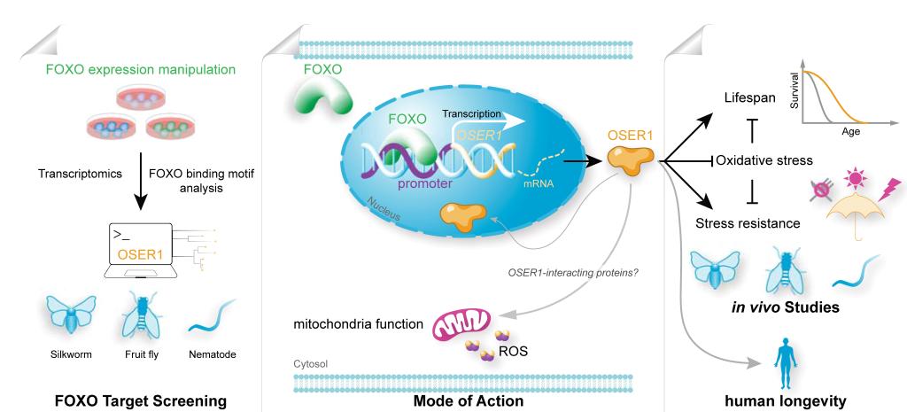 為了闡釋OSER1調(diào)節(jié)長(zhǎng)壽的作用機(jī)制,研究團(tuán)隊(duì)在家蠶、線蟲和果蠅中進(jìn)行了一系列的分子生物學(xué)實(shí)驗(yàn)。研究結(jié)果共同表明,OSER1是叉頭框蛋白O的直接靶基因,OSER1能夠響應(yīng)過氧化氫誘導(dǎo)的氧化應(yīng)激,并通過提升機(jī)體氧化應(yīng)激防御力發(fā)揮延長(zhǎng)壽命的作用。