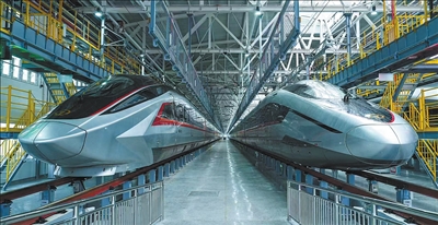 圖為兩列CR450動車組樣車??吭诤币瞬齽榆囁?。唐 瑩攝(人民視覺)