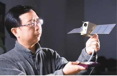 中科院院士潘建偉在辦公室內(nèi)與“墨子號(hào)”量子衛(wèi)星模型合影。(新華社記者 張端 攝)
