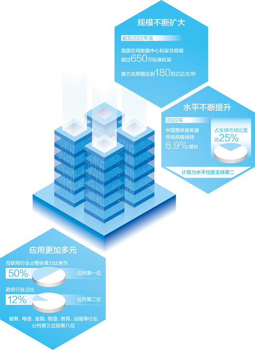 算力作為數(shù)字經(jīng)濟(jì)時(shí)代新的生產(chǎn)力,對(duì)推動(dòng)科技進(jìn)步、賦能行業(yè)數(shù)字化轉(zhuǎn)型、促進(jìn)經(jīng)濟(jì)社會(huì)發(fā)展發(fā)揮著日益重要的作用。近年來(lái),我國(guó)算力產(chǎn)業(yè)不斷發(fā)展、創(chuàng)新能力日益提升,截至2022年底,我國(guó)在用數(shù)據(jù)中心機(jī)架總規(guī)模超過(guò)650萬(wàn)標(biāo)準(zhǔn)機(jī)架,算力總規(guī)模達(dá)到180百億億次/秒。