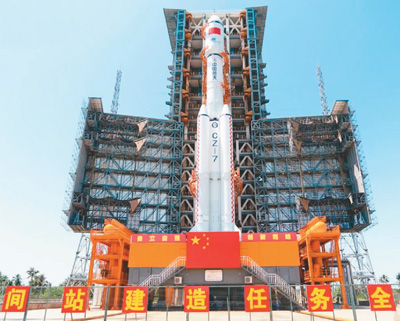 執(zhí)行天舟二號發(fā)射任務(wù)的長征七號立于發(fā)射塔架,整裝待發(fā)。(二〇二一年五月)新華社發(fā)