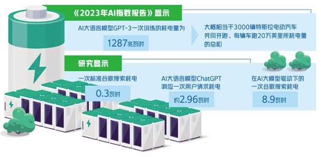 人工智能大模型到底有多耗能?據(jù)斯坦福人工智能研究所發(fā)布的《2023年AI指數(shù)報告》,AI大語言模型GPT-3一次訓練的耗電量為1287兆瓦時,大概相當于3000輛特斯拉電動汽車共同開跑、每輛車跑20萬英里所耗電量的總和。報告同時提出,AI大語言模型GPT-3一次訓練,相當于排放了552噸二氧化碳。