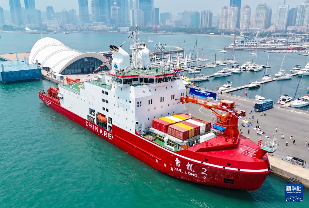 7月3日,“雪龍2”號極地科考破冰船靠泊在青島奧帆中心碼頭(無人機照片)。新華社發(fā)(張進剛攝)